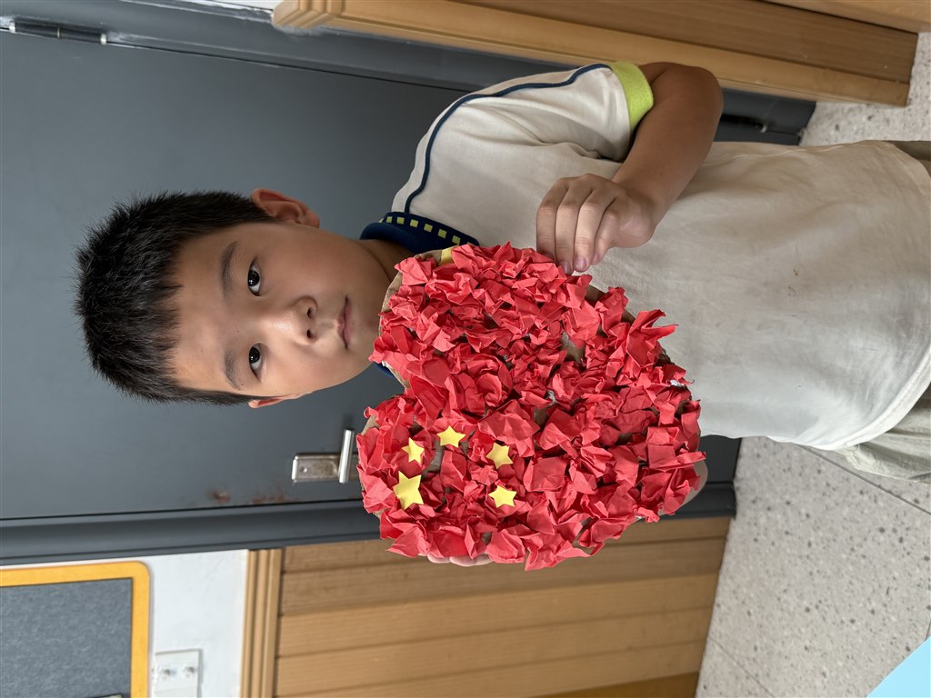 朱俊皓用红纸,精心制作了一个充满爱国情怀的手工作品。这个心形作品,犹如一颗炽热的爱国之心,跳动着对祖国的深情与敬意。每一道褶皱都像是历史的印记,记录着先辈们为了国家独立和民族解放,所付出的艰辛努力和巨大牺牲。