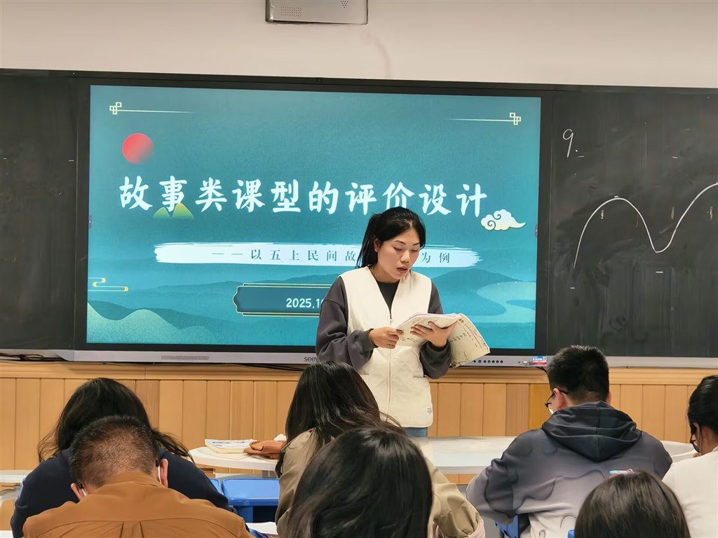 最后,课程中心主任陈云老师进行了微分享。认为本次民间故事单元的评价设计,分课前、课中两层推进:课前通过交流、游戏闯关,了解学生预习投入度与民间故事认知基础,为课堂铺垫;课中紧扣朗读、情节概括等能力,用星级评价、学习单、同伴互评等方式分层检测。评价要既以“情节梯”“人+事”搭表达支架,又借游戏、星级点赞激发表达兴趣,还通过针对性反馈明确改进方向,更以“文化传承”为导向,引导学生在表达中融入民间故事的文化内涵,实现了能力提升与文化传承的双重目标。