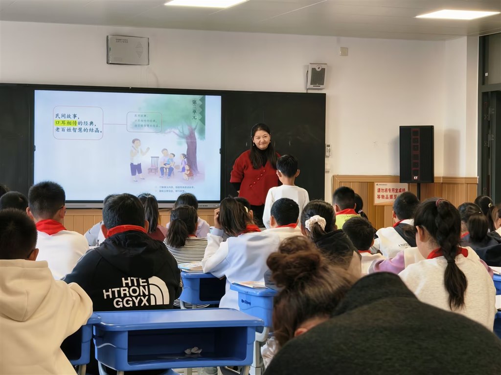 赵美雯老师执教整本书阅读《中国民间故事》的推进课。赵老师紧扣“把握故事主要内容、感受民间故事的神奇”等语文要素,以“民间故事宣讲员招募”为情境主线,通过“趣探故事——梳理情节讲清楚”“对比版本——发现神奇悟特点”“创编故事——传承经典展创意”等环节,引导学生抓关键词句梳理情节、对比不同版本感知民间故事的灵动特质,最终借助“删减、调换”等方法创编故事。课堂既落实了“讲好故事”的能力目标,也让学生在探究中体会到民间故事的文化魅力,实现了语文能力与文化传承的双向落地。