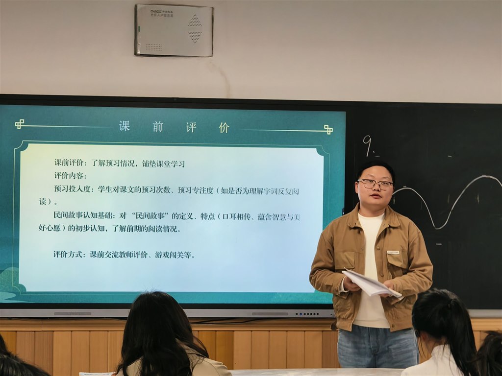同组教师张丹老师对赵老师的课进行了深入点评,认为结合民间故事单元要素,借童谣导入,用情节梯教学生提炼信息、简洁讲清故事;通过对比内容(“神奇的三”)和版本,教创编方法,还渗透文化与思维拓展,课后作业衔接创编评价。课虽未展成果,却落实了阅读能力与单元任务,尽显团队智慧。花叶老师认为老师执教民间故事课时,以评促学:课始借猜图做诊断性评价,把握学情并导入主题;课中用朗读标准、“人+事”概括等评价任务,助学生梳理情节、品析细节;还通过评价量表推动学生运用方法讲故事,实现能力进阶。